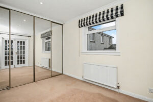 Moving through the property, the hallway connects seamlessly to all bedrooms and the shower room. The bungalow features three bedrooms, with the master benefiting from built-in mirrored wardrobes. Each room is dressed in neutral tones and is filled with natural light thanks to large windows, creating a bright and airy atmosphere.