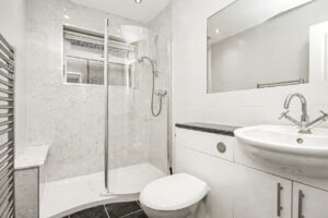 Lastly, you reach the modern shower room, which has been finished to a very high standard. It features a double shower cubical, alongside a matching white ceramic bathroom suite, including a toilet and wash basin with under-sink storage.