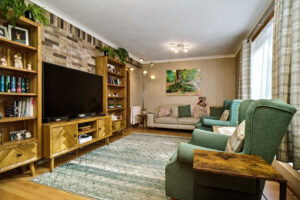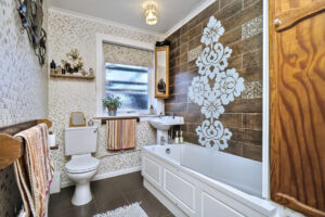The family bathroom is on the ground floor and features a three-piece suite, a shower over the tub, and a neutral-toned design. This combination is both practical for a family’s needs and aesthetically pleasing. A fitted unit that offers hidden storage for a clutter-free look is installed.