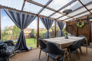 The rear of the property is a fully sheltered space designed for year-round use, specifically for grilling and dining. The setup includes a dedicated grill and an outdoor seating area. The space is fully protected from the elements, a practical feature for the unpredictable Scottish weather, allowing for al fresco dining regardless of rain or wind.