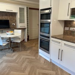 Back through the hallway, which has a large understairs closet for that desired storage space, you reach the kitchen which again has its own dining space for quick dining after a busy day or early rises. The minimalist designed kitchen’s technology is seamlessly integrated, with integrated appliances such as a double and single oven, microwave, gas hobs and extractor fan, and dishwasher. There is also a waste disposal system in the kitchen sink.