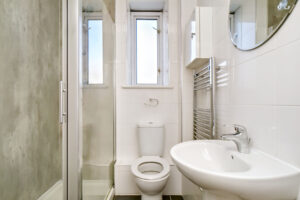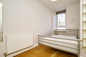 The bedroom which is double in size, offers ample space to accommodate free-standing furniture. Cleverly concealed behind a set of sliding doors is an integrated cupboard, providing excellent hidden storage. Inside, you’ll find hanging rails for clothes and drawers for organized storage, ensuring the room remains a clutter-free and tranquil space.