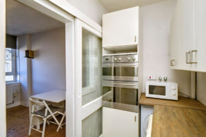 Bathed in natural light from a window that offers striking views over the rooftops, this lounge creates an exceptionally airy and welcoming living space. The room is fully equipped for comfort and convenience, with a sofa bed, table and chair included as part of the sale.