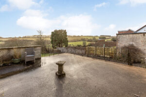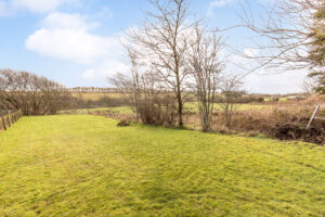 The property features a galley-style kitchen, equipped with comprehensive floor-to-wall mounted units for seamless, tidy storage. A window strategically placed above the sink offers scenic views of the expansive back garden and the open fields beyond. Adjacent is a practical utility room, providing direct access to the rear garden’s patio area, which is situated above the under-floor level garage.